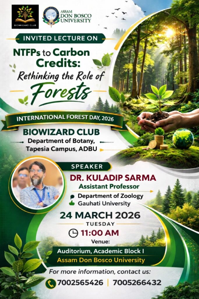 The Biowizard Club, Department of Botany, Assam Don Bosco University (ADBU), is organizing an invited lecture on the theme “NTFPs to Carbon Credits: Rethinking the Role of Forests” on the occasion of International Forest Day, 2026.