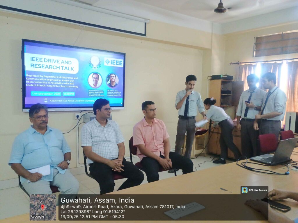 The Department of Electronics and Communication Engineering, Assam Don Bosco University, in collaboration with the IEEE Student Branch, ADBU, organized an “IEEE Drive and Research Talk” on 13th September 2025 at room no. 414, Azara Campus. The event aimed to promote IEEE membership awareness among students and foster researchinteractions with eminent academicians from the Indian […]