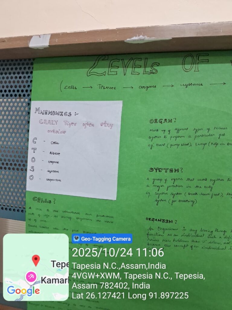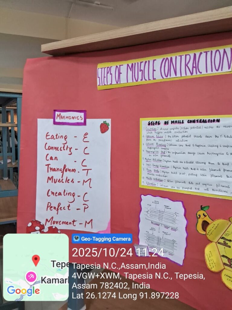 Students of B. Pharm 3rd semester were divided into 15 groups of four members each and were assigned specific topics in Human Anatomy and Physiology. Each group utilized the mnemonic technique to prepare creative chart-based presentations aimed at simplifying complex concepts and improving memory retention.