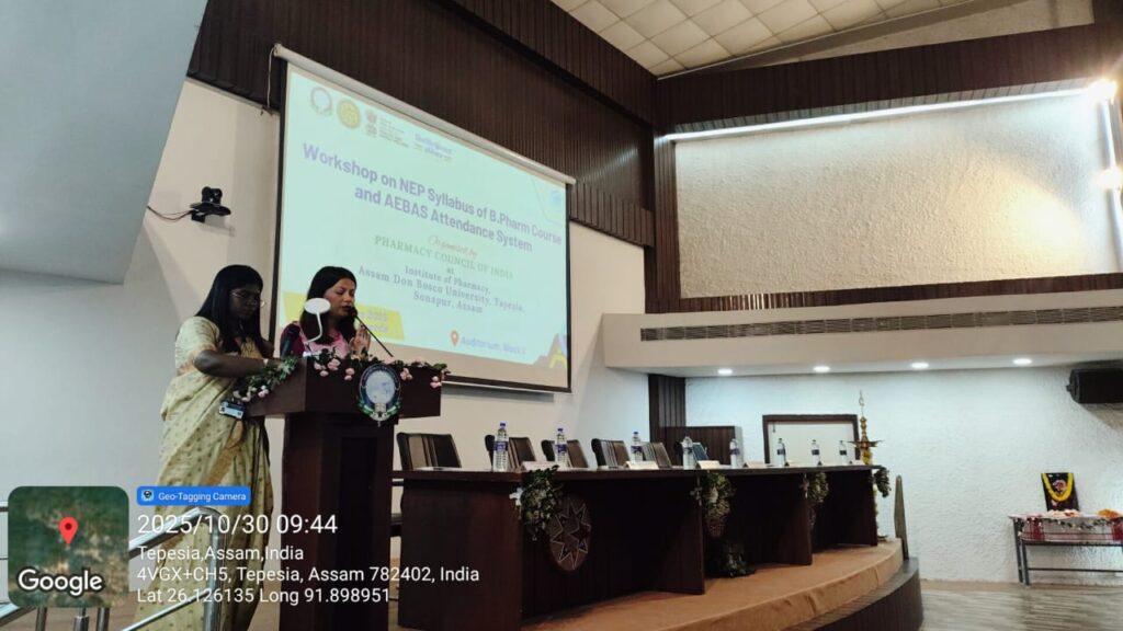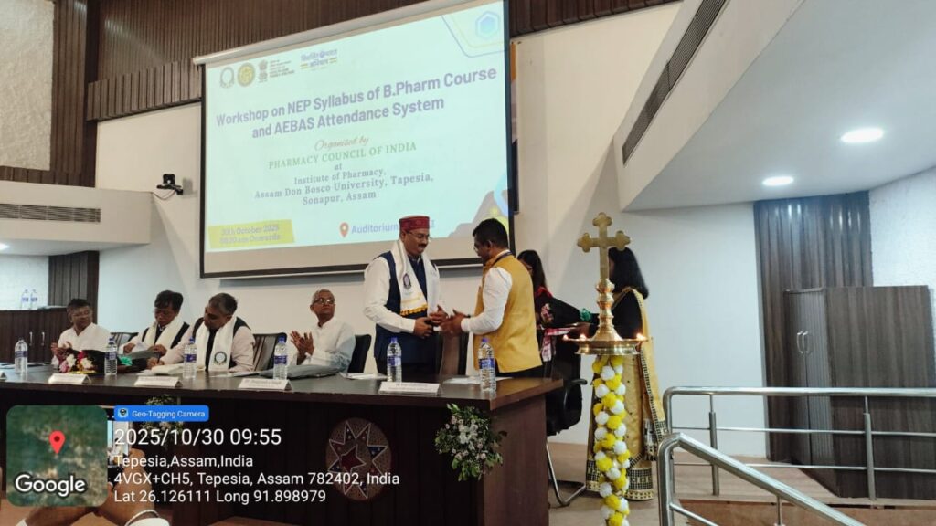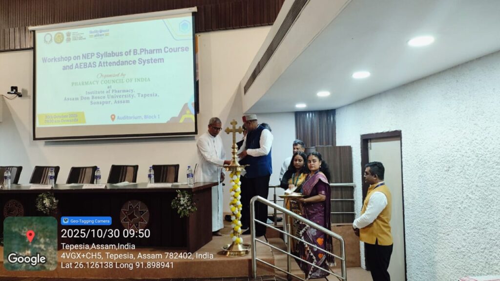 A one-day workshop on the NEP Syllabus of the B.Pharm Course and the AEBAS Attendance System was successfully conducted at the Institute of Pharmacy, Assam Don Bosco University (ADBU), Tepesia, Sonapur. The event was organised by the Pharmacy Council of India (PCI) and hosted by ADBU, aiming to familiarise faculty members and administrators with the newly revised B.Pharm syllabus under the National Education Policy (NEP) 2020 and the implementation of the Aadhaar Enabled Biometric Attendance System (AEBAS).