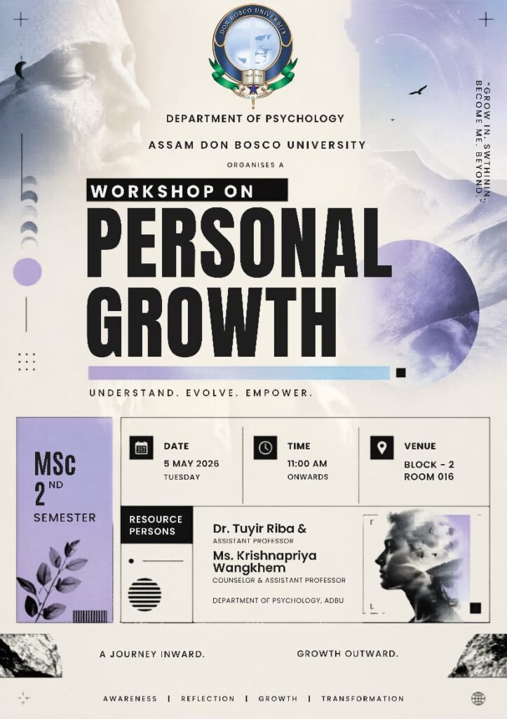 The Department of Psychology at Assam Don Bosco University is all set to organize an engaging and insightful Workshop on Personal Growth on 5th May 2026. Designed especially for MSc 2nd Semester students, this workshop aims to foster self-awareness, emotional understanding and personal transformation.
