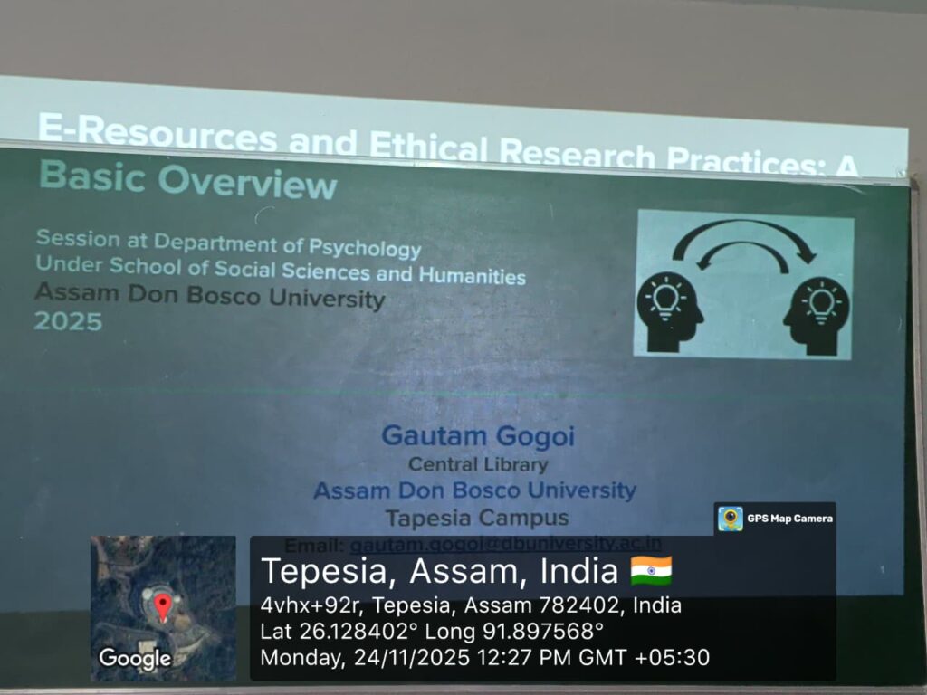 The Department of Psychology, Assam Don Bosco University, Tapesia, organized a workshop on “E-Resources and Ethical Practices: A Basic Overview” on 24th November 2025 under the Journal Club. The workshop aimed to familiarize postgraduate students with the effective use of digital academic resources and to promote ethical practices in research and academic writing.