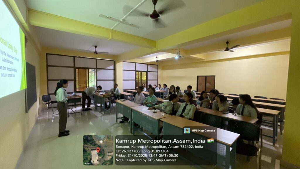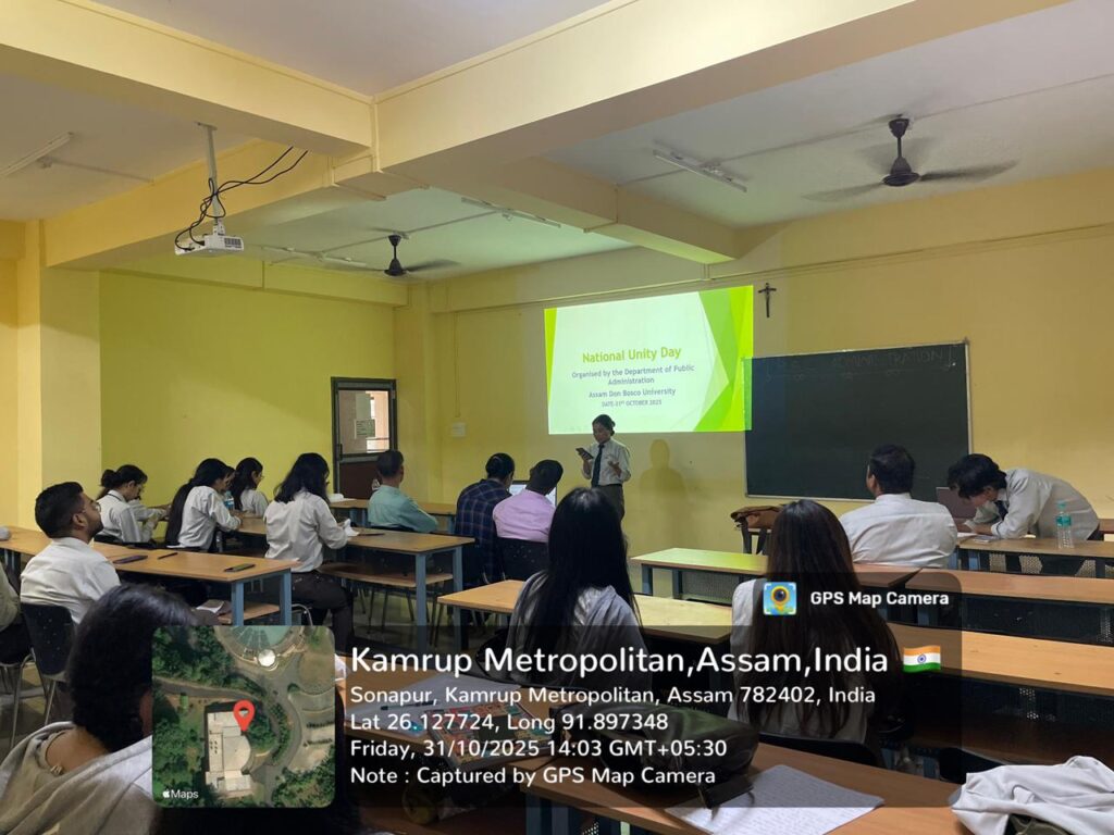 The Department of Public Administration, Assam Don Bosco University, organised the observance of National Unity Day (Rashtriya Ekta Diwas) on 31 October 2025 at the Department premises, Academic Block 5. The event commemorated the birth anniversary of Sardar Vallabhbhai Patel, celebrating his invaluable contribution to national integration and unity.