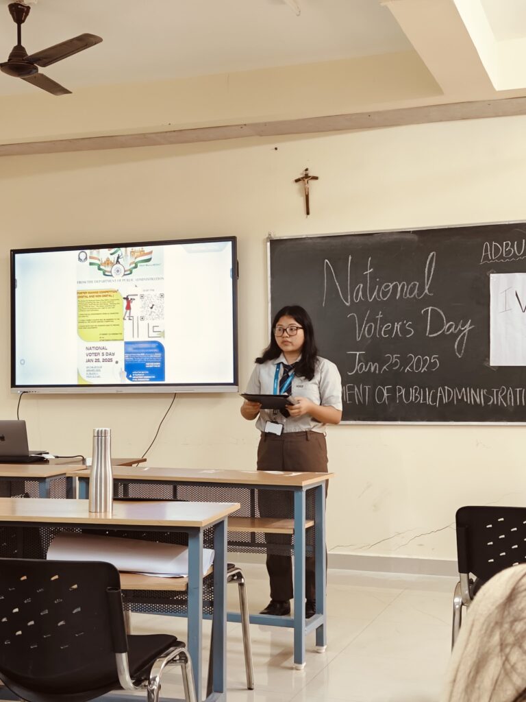The Department of Public Administration, Assam Don Bosco University (Tapesia Campus), organized the National Voter’s Day Celebration 2025 on 25th January 2025 at Block V from 10:00 AM to 11:00 AM.