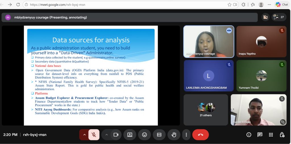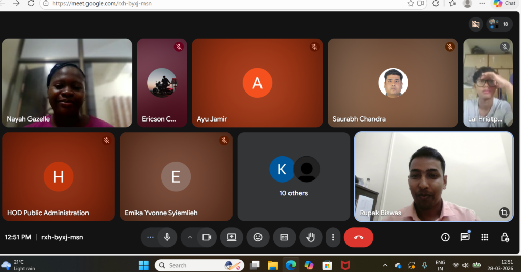 The Department of Public Administration, Assam Don Bosco University, organised a Two-Day Online Workshop on Research Methodology on 28 and 29 March 2026. The workshop aimed to strengthen participants’ understanding of research methods, with a special focus on qualitative analysis and the practical application of SPSS for data analysis.